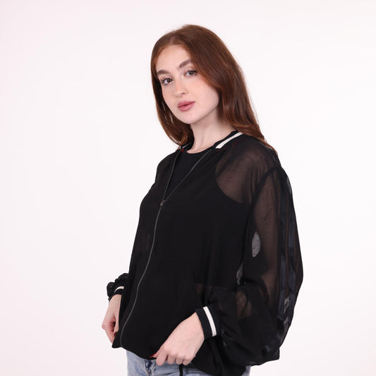 Black Cropped Blazer with Chain and Ruffle Collar Detail
