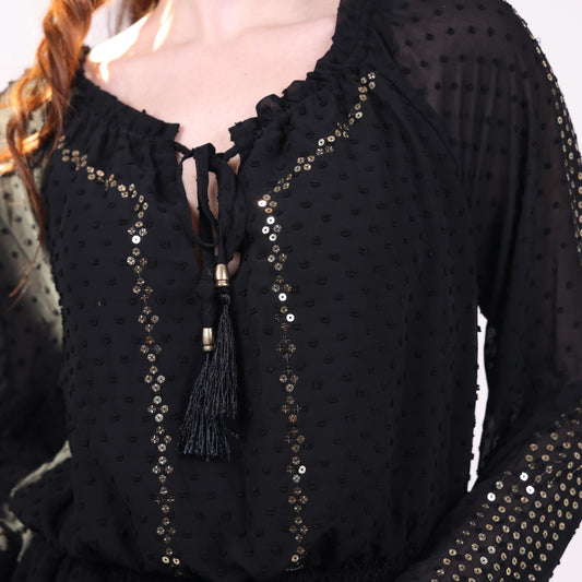 Black Quilted Short-Sleeve Top with Textured Detailing