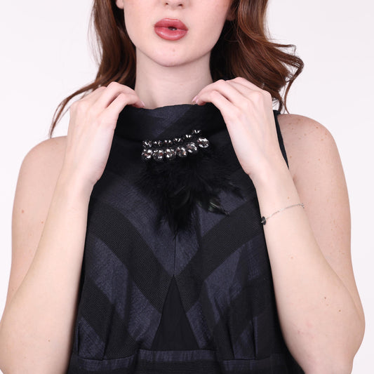 Black Sleeveless Striped Maxi Dress with Embellished Collar