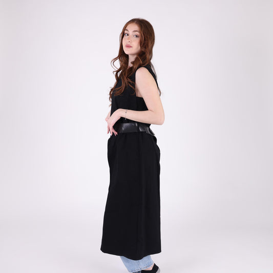 Black Sleeveless Longline Vest with Front Slit and Belted Waist