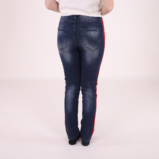 Distressed Dark Blue Jeans with Red Side Stripes