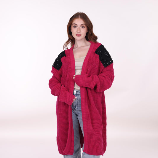 Fuchsia Long Knit Cardigan with Embellished Shoulder Detail