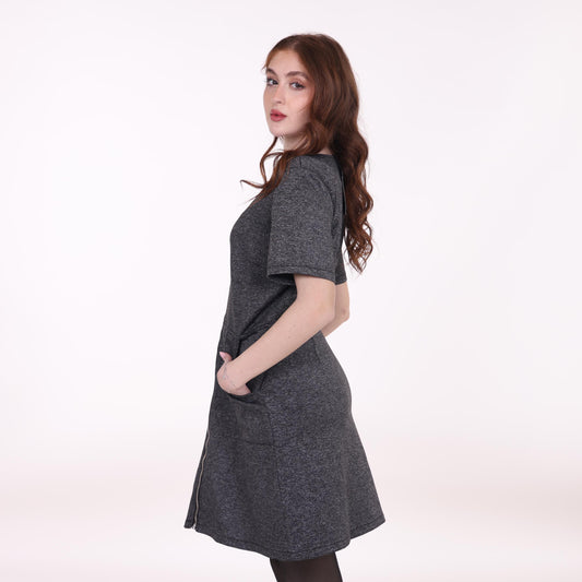 Charcoal Zip-Front Dress with Short Sleeves and Pockets