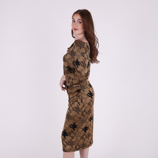 Printed Ruched Midi Dress with Long Sleeves in Earth Tones