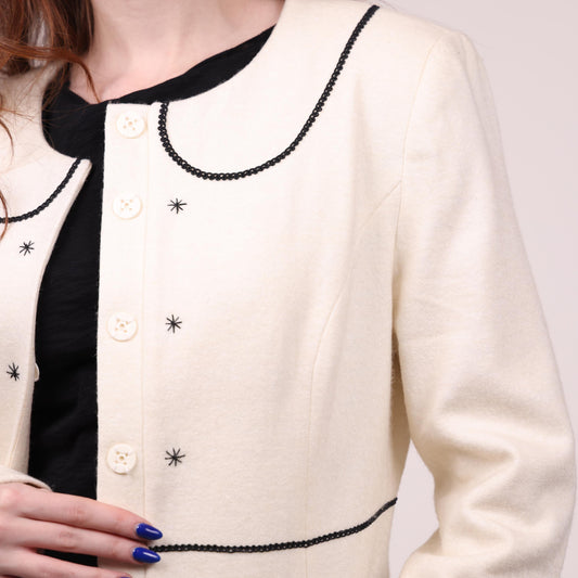 Cream Button-Up Jacket with Black Embroidered Accents