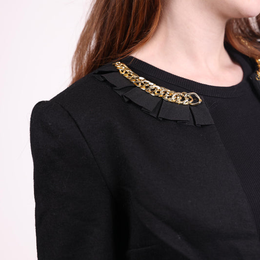 Black Cropped Blazer with Chain and Ruffle Collar Detail