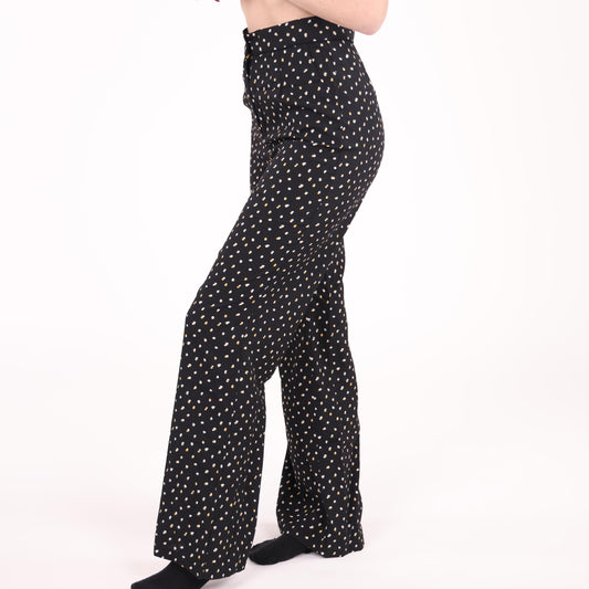 Black Wide-Leg Pants with White and Yellow Polka Dot Pattern