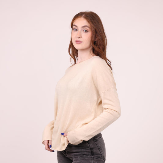 Soft Beige Long-Sleeve Relaxed Knit Top
