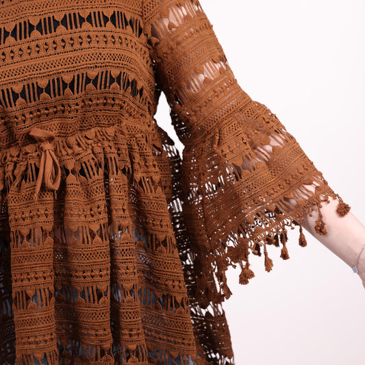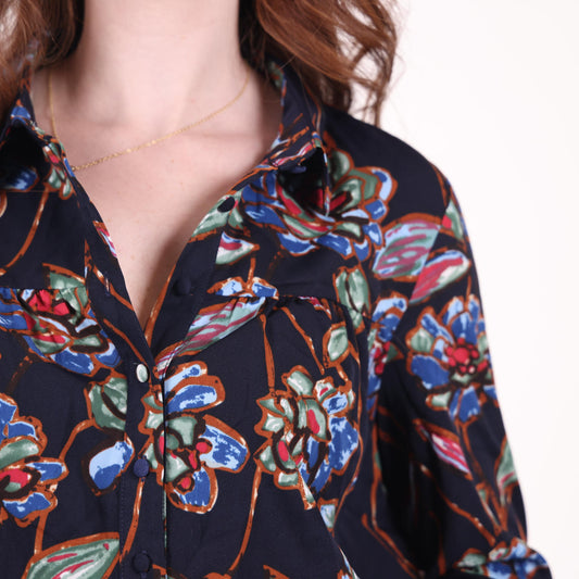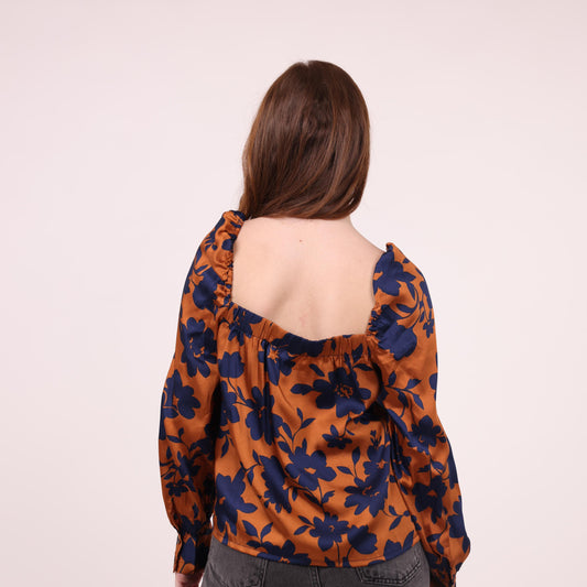 Rust and Navy Floral Print Blouse with Puff Sleeves
