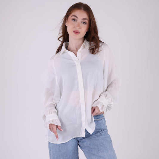 Classic White Button-Up Blouse with Ruffle Cuffs