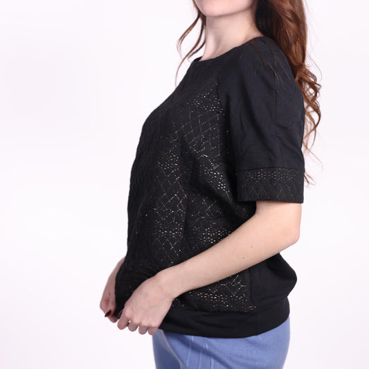 Black Quilted Short-Sleeve Top with Textured Detailing